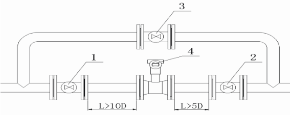 不允許直接在流量計測量管前后端安裝閥門、 彎頭等極大改變流體流態的部件, 如果需要在流量計前后管道上安裝閥門、 彎頭等部件也應盡量保證前后直管段長度, 直管段要求前10D,后 5D, 對于新完工的工藝管道, 應先進行初步吹掃后再安裝流量計。