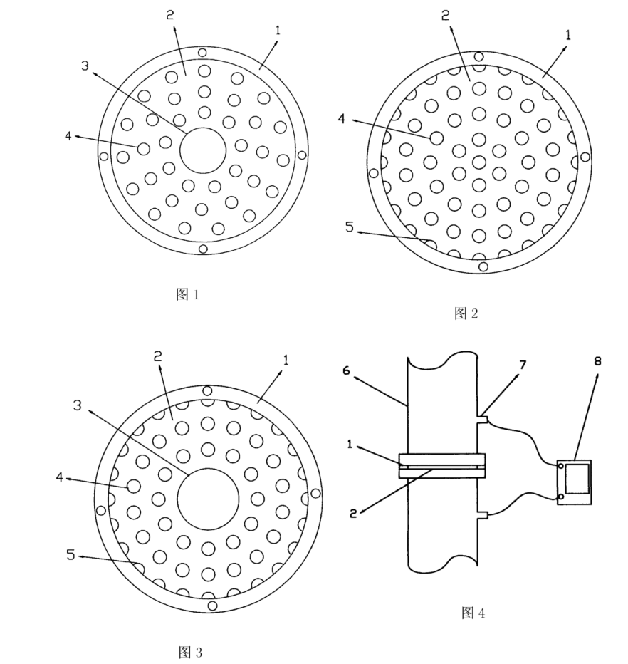 不同的基板品種 、不同的大圓孔直徑、不同的小圓孔直徑、不同的非整圓面積、不同的開孔事(多孔板上所有孔洞的面積與基板面積的比率),多孔板具有不同的阻力系數(shù),決定了流量計(jì)顯示的數(shù)據(jù)與管道中流體的流量之間有不同的數(shù)量關(guān)系式,該關(guān)系式事先設(shè)計(jì)和計(jì)算確定,使用時(shí)通過檢測多孔板前后的靜壓差,可以方便地?fù)Q算出流量值的大小。[01]本發(fā)明中, 所述的流量計(jì)為第一種時(shí),數(shù)值在線測量直讀,簡單易用:第二種將壓差轉(zhuǎn)變?yōu)殡妷夯螂娏餍盘?hào),再有配套的二次儀表顯示,便于實(shí)現(xiàn)遠(yuǎn)程在線測量;第三種的二次儀表要求低,能夠減小二次儀表的配套費(fèi)用。