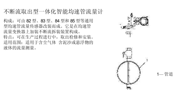適用范圍:適用于既需流量測量又需溫度或壓力測量或溫度壓力測量的高溫高壓液體各種工況的氣體和蒸汽測量。由此可方便地在人工智能流量運(yùn)算顯示器中作被測介質(zhì)流量的溫壓補(bǔ)償連續(xù)反吹型一體化智能均速管流量變換器構(gòu)成:它由 81型、82型、83型、84型和85型等通用型均速管流量傳感器改裝而成。