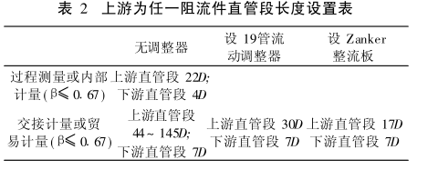 在無流動調(diào)整器情況下,孔板流量計(jì)的直徑比、值小于等于067,且滿足孔板上游為任意阻流件時,孔板上游直管段長度按規(guī)定至少應(yīng)有44D,在阻流件為特殊復(fù)雜管路或匯管時,上游直管段長度可能需要60~145D。如此長的直管段會增大站場面積,增加安裝難度,不利于工程費(fèi)用的降低和實(shí)施,見表2。