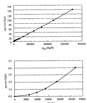 公司對線性孔板進行逐臺標定是以水為介質,不同口徑得線性孔板均選擇14個標定點,其中流量較小時,標定點排得較密,圖3.4所示為一臺DN200線性孔板得標定曲線。圖中的差壓單位為inH2O,(linH2O=249.0889Pa),表3.1所列的是一臺DN200的線性孔板的實際標定數據,其中從體積流量換算到質量流量是建立在水的密度p=998.29kg/m3基礎上的。