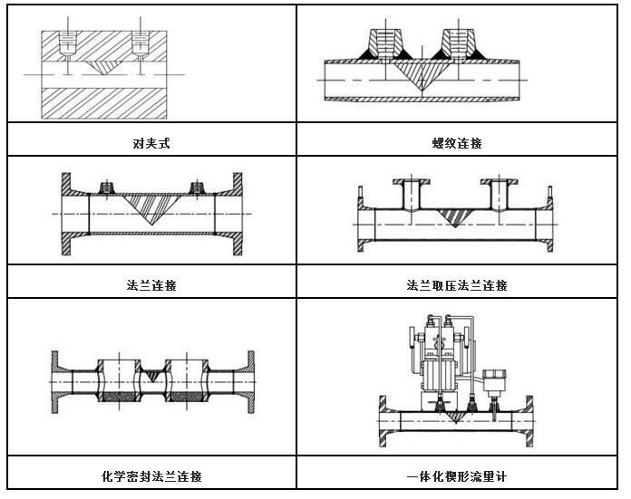 楔形流量計按其組裝方式分為一體型和分離型,按其連接方式分為法蘭連接、焊接連接、螺紋連接及對夾式連接,按其取壓方式分為普通取壓、法蘭密封取壓等結構。詳見下表: