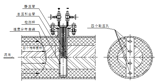 阿牛巴流量計由檢測桿、取壓口和導桿組成。均速管的檢測管截面形狀分為圓形、菱形、橢圓形等多種結構。如圖所示;
